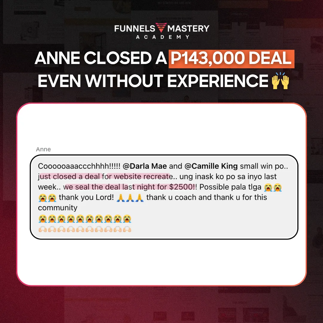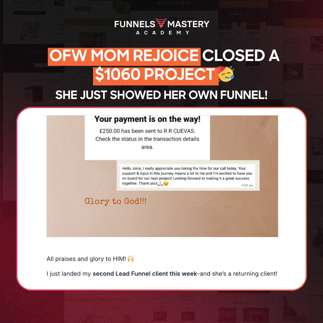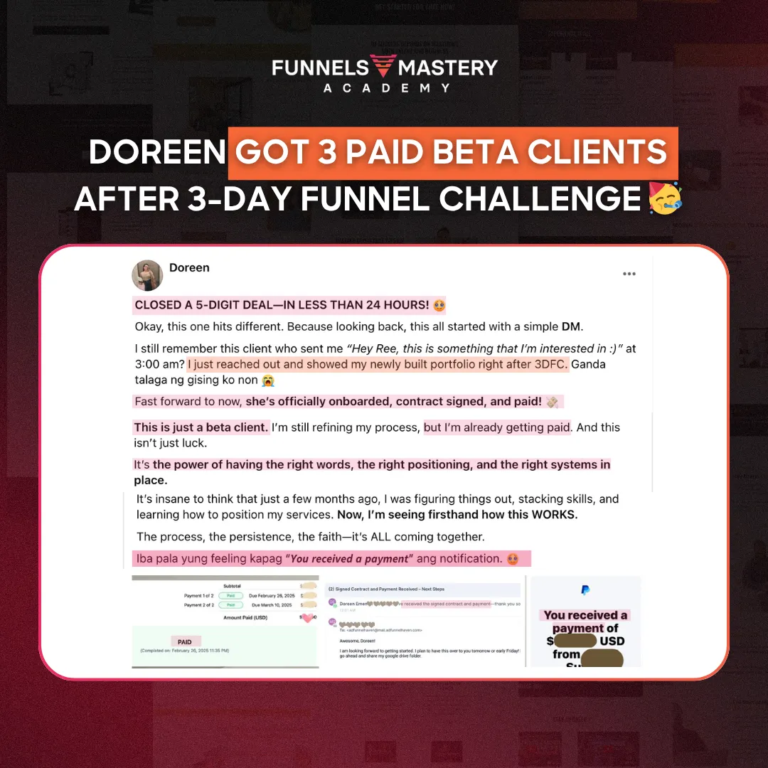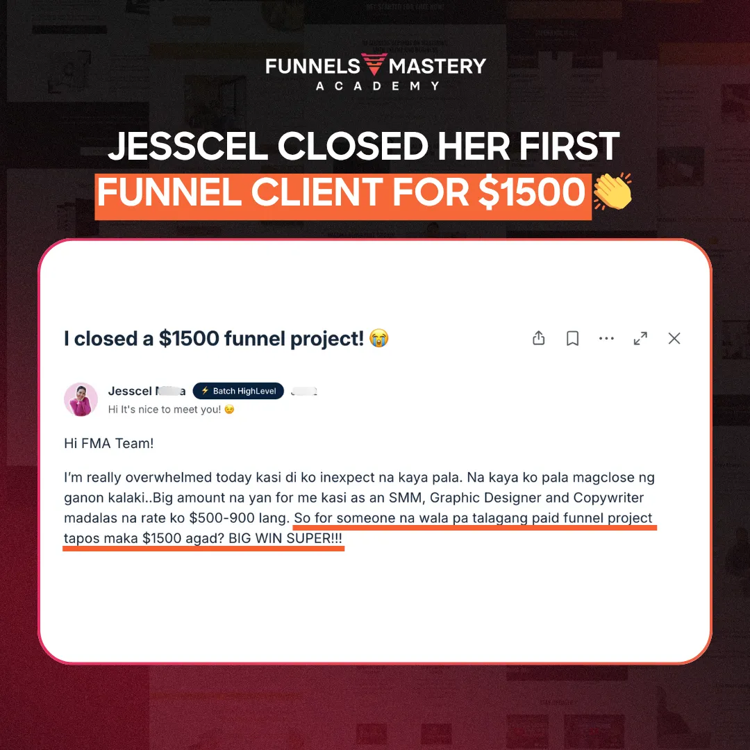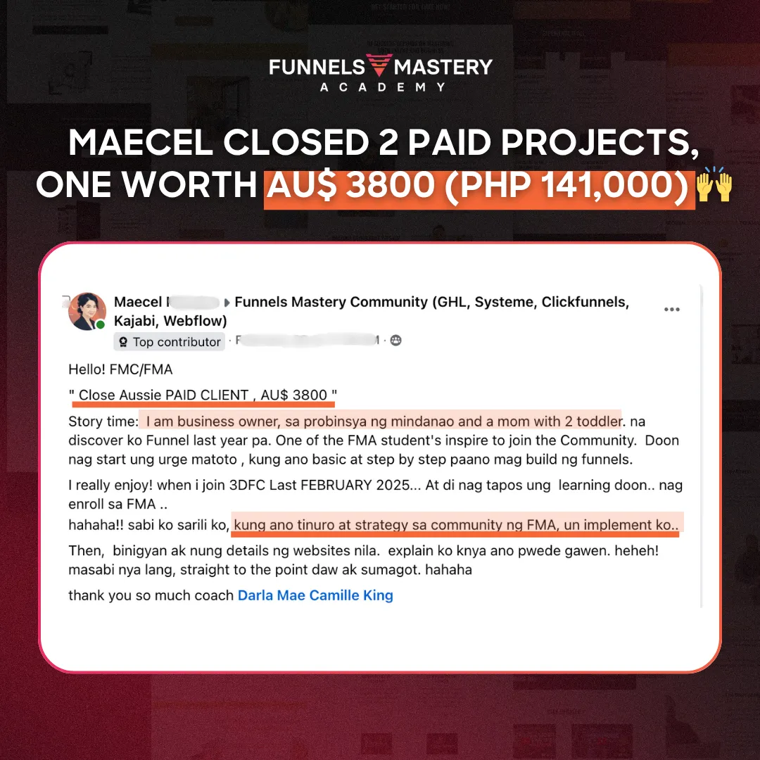What happens when people take action? They post their wins. There are real posts, messages, and screenshots from students inside our Funnels Mastery Community.