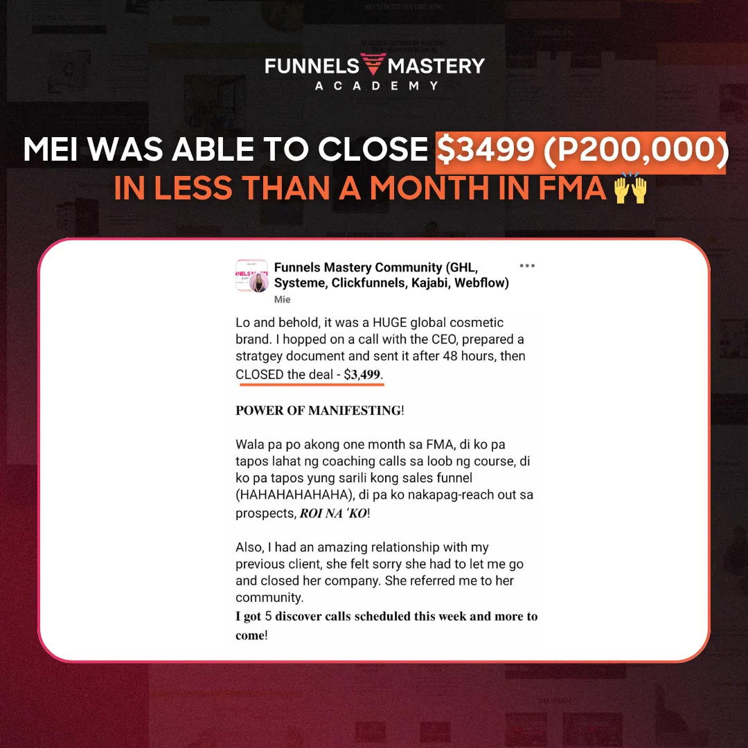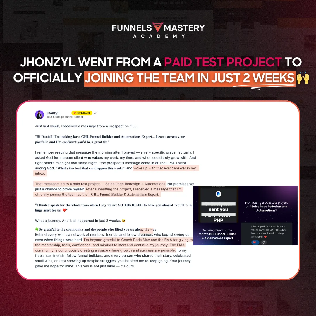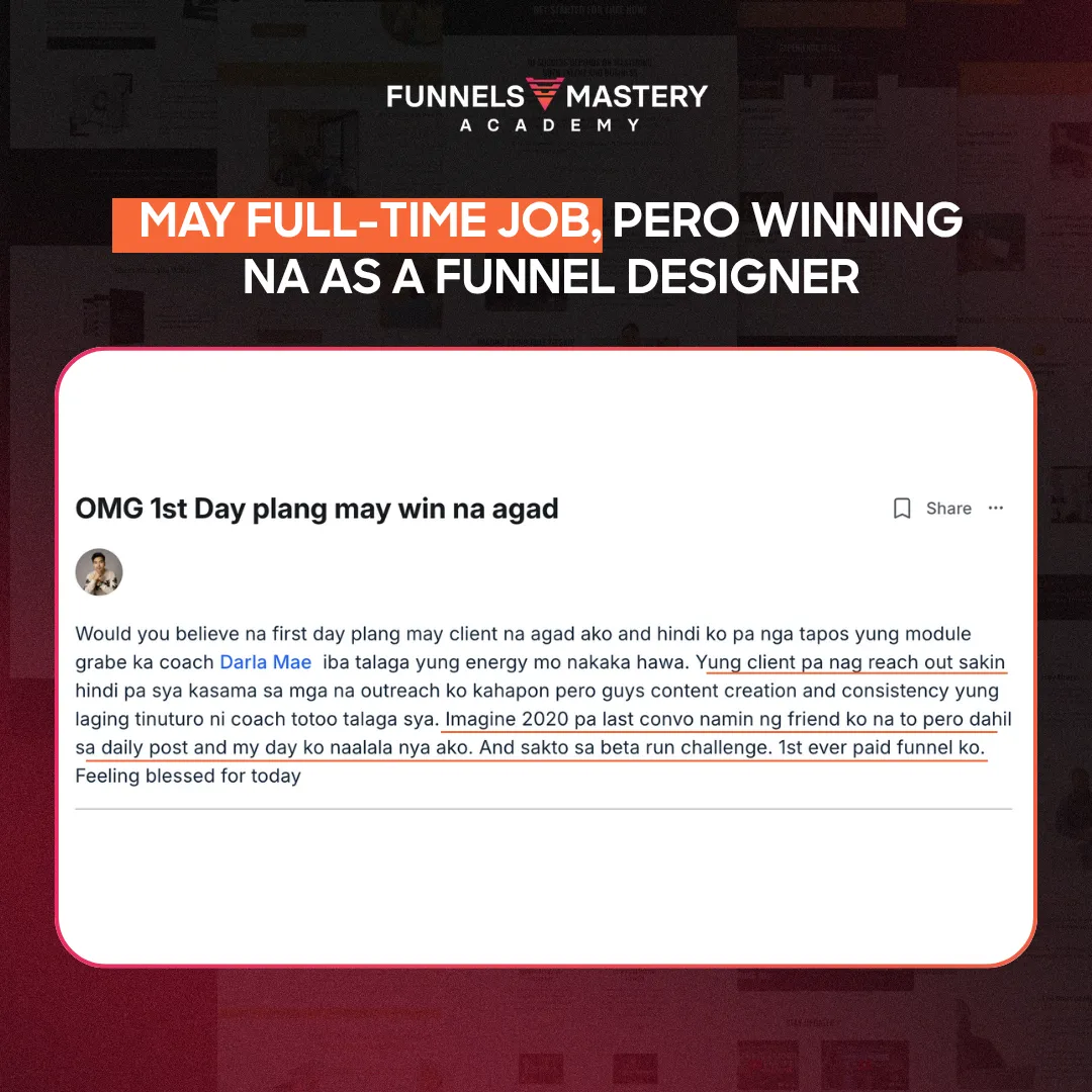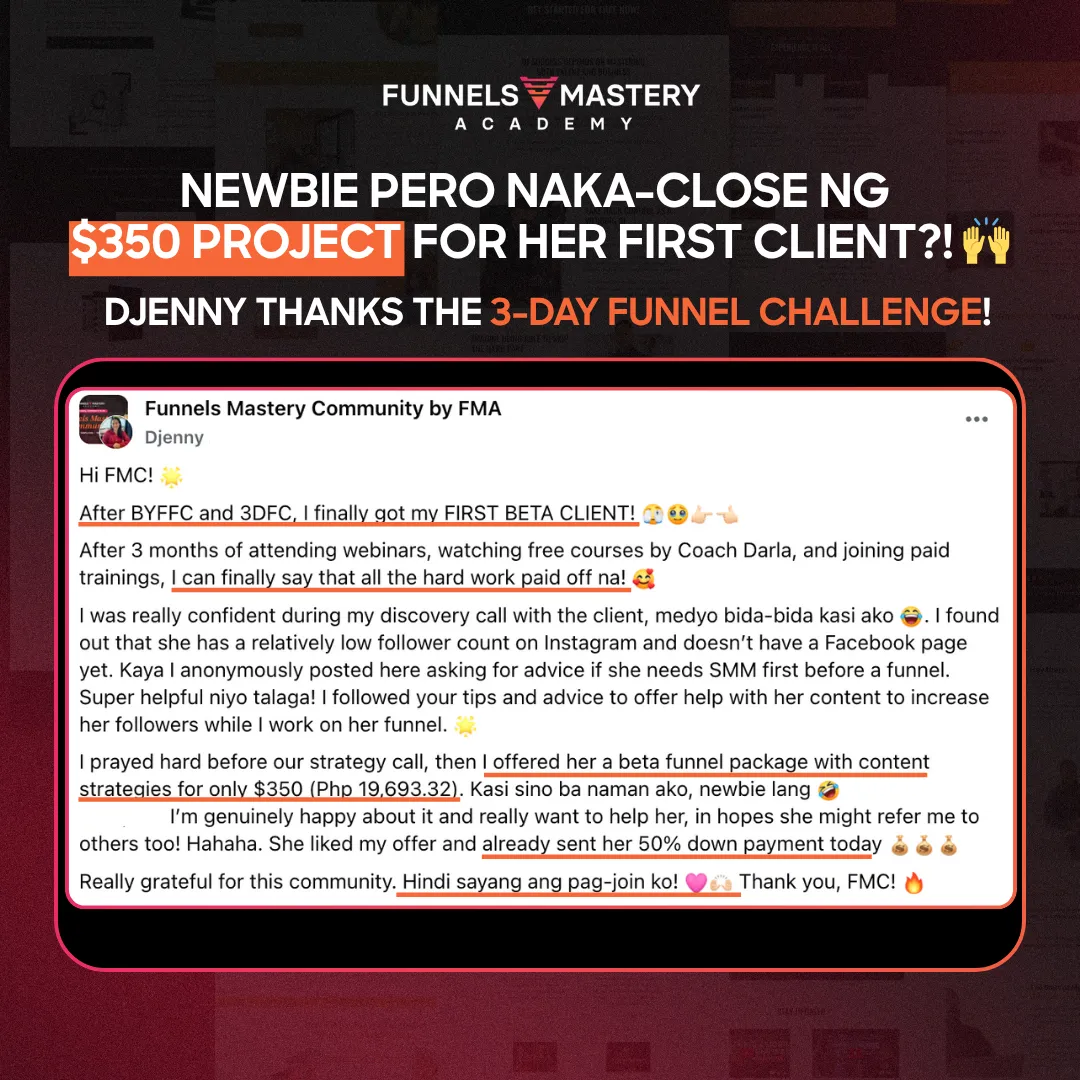 What happens when people take action? They post their wins. There are real posts, messages, and screenshots from students inside our Funnels Mastery Community.